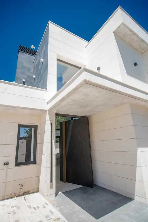 Puerta pivotante acorazada modelo Laurent Dekton con tirador dorado
